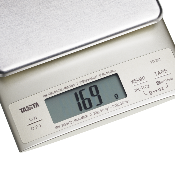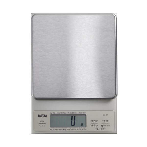 Tanita KD-321 ima mogućnost konverzije tekućine. Prikaz na vagi može se jednostavno promijeniti iz ‘grama’ u ‘mililitre’, što vam omogućuje vaganje tekućih jedinica kao što su voda ili mlijeko bez upotrebe dodatne posude za mjerenje.